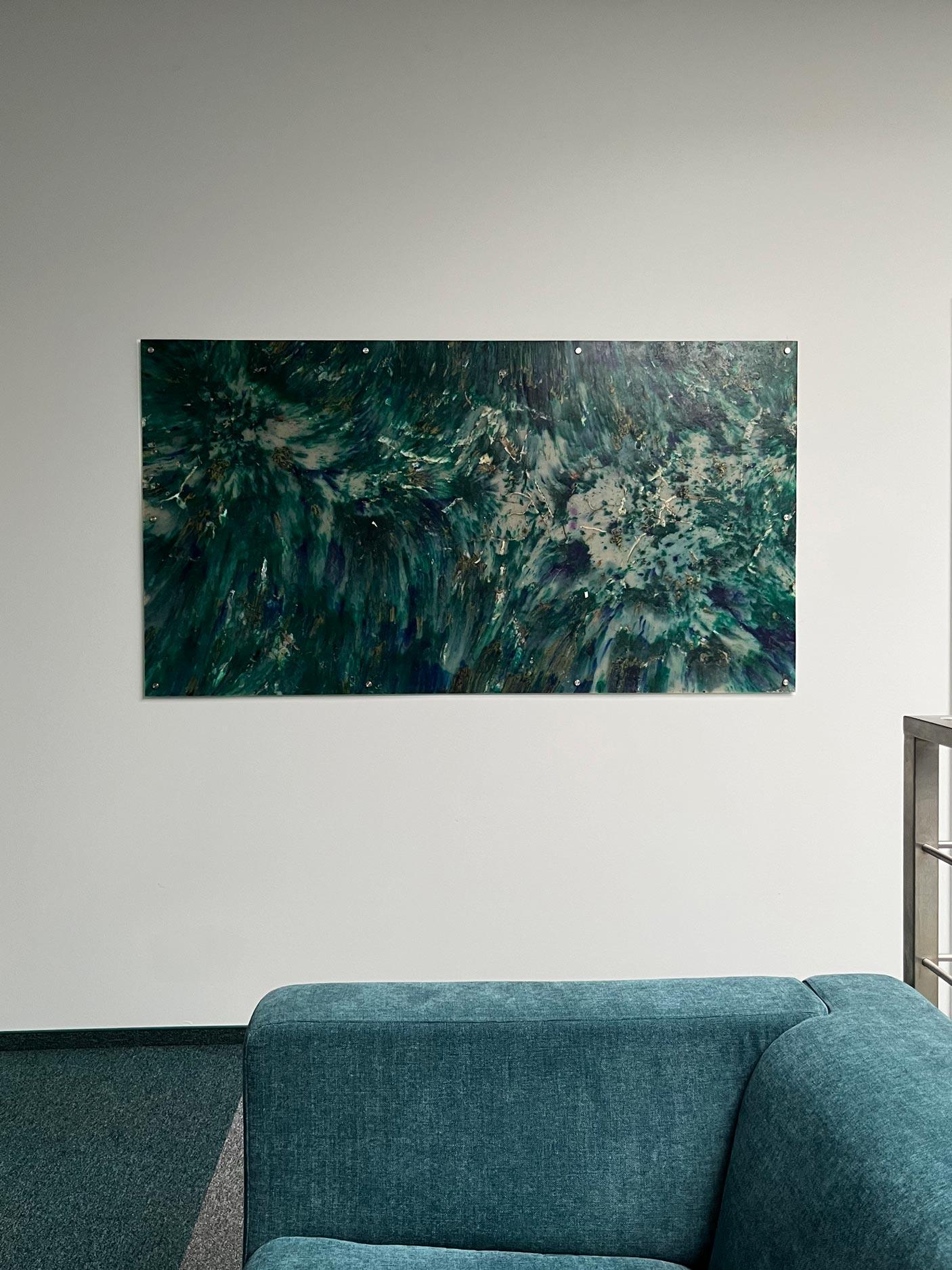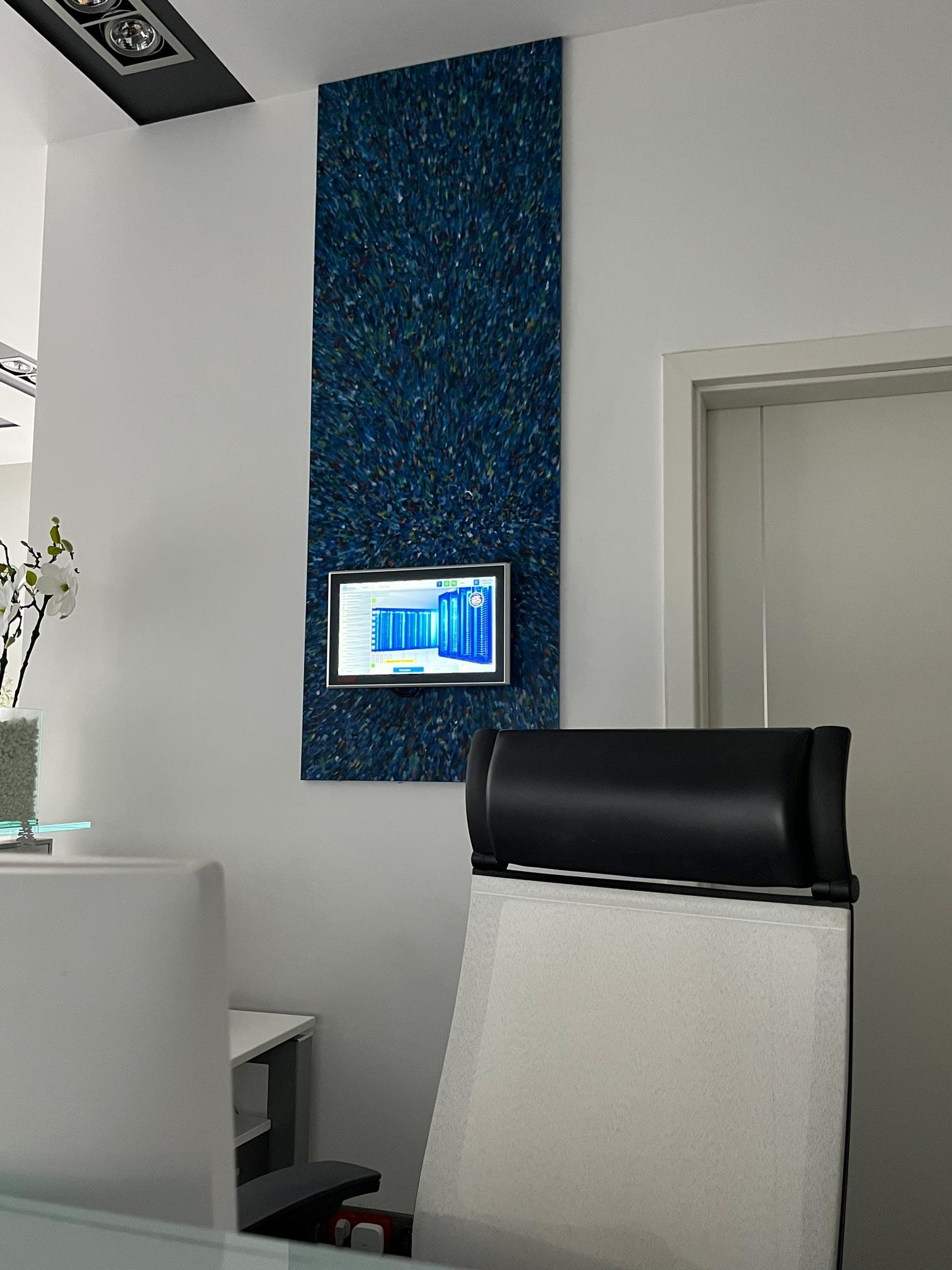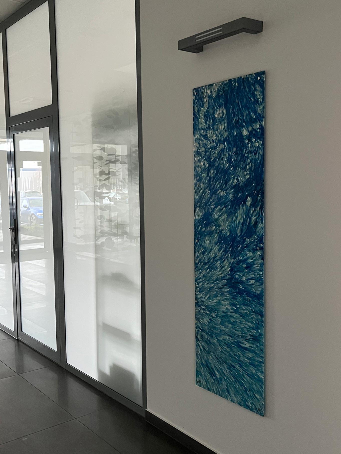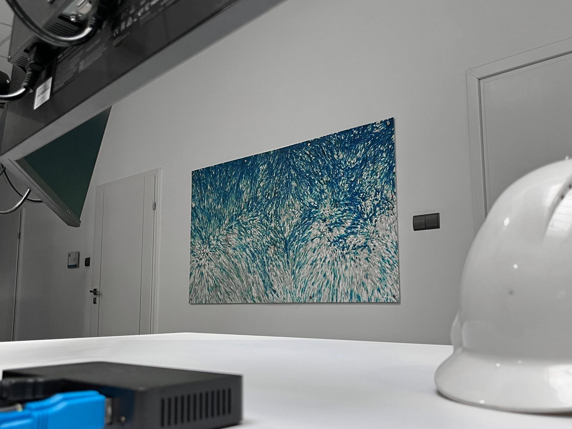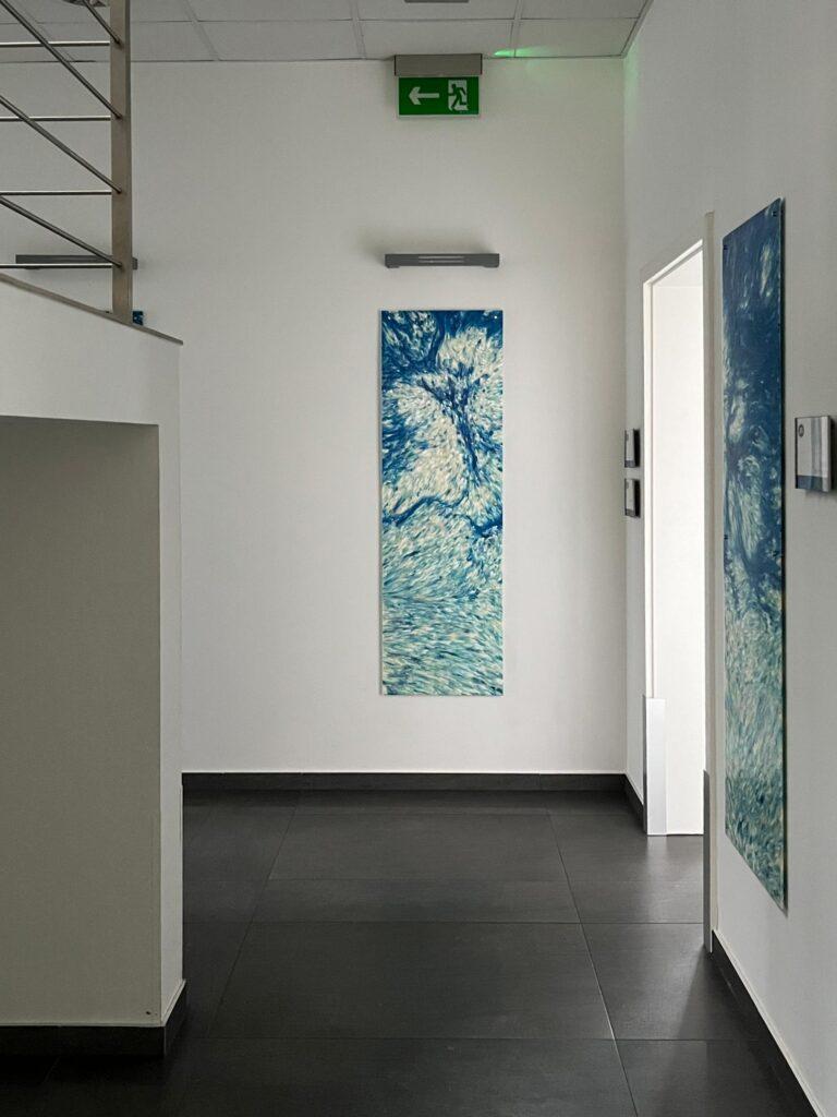 Zawiesiliśmy panele dekoracyjne z plastikowych odpadów: przemiału nakrętek oraz sieci rybackich, które zawisły w siedzibie iPS Team w Jasinie. Niepowtarzalne wzory zdobią przejścia komunikacyjne oraz przestrzenie open space. Kolorystyka paneli została dobrana pod marki: piętro zajmowane przez iPS Control® zostało zaaranżowane niebieskimi kompozycjami. Na drugim piętrze, na którym pracują inne marki, zostały zawieszone panele z sieci widm, czyli zagubionych sieci rybackich, wyłowionych z Morza Bałtyckiego dzięki współpracy z Fundacją MARE oraz kołobrzeskiego KGPR.